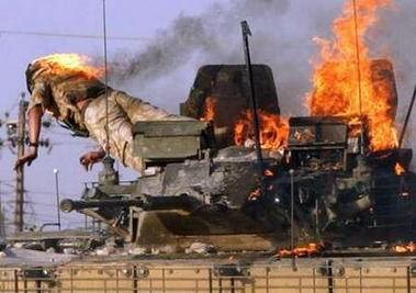 Several articles have already turned the story against the angry Iraqis who fought the British tanks as they demolished the jail wall, painting them as aggressive Shia militia attacking the doe-eyed, innocent troops responding to the concern that their comrades were held by religious fanatics. A photograph of a troop on fire comes complete with commentary that the vehicles were under attack during a "bid to recover arrested servicemen" that were possibly undercover. All criminal elements of British treachery are downplayed, the car's explosive cache is never mentioned and the soldiers who instigated the affair are made victims of an unstable country they are defending.
